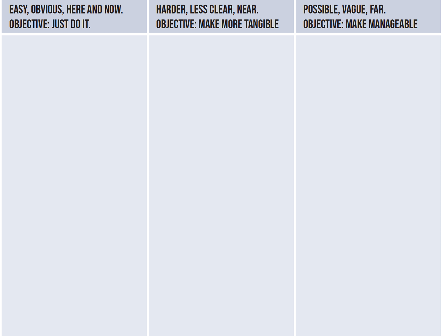 You get the ‘Possibles’ closer to ‘Easy’. The objective here is to break down the areas into more tangible potential actions, with an emphasis on actions of maximum leverage, or ‘Fulcrums’.