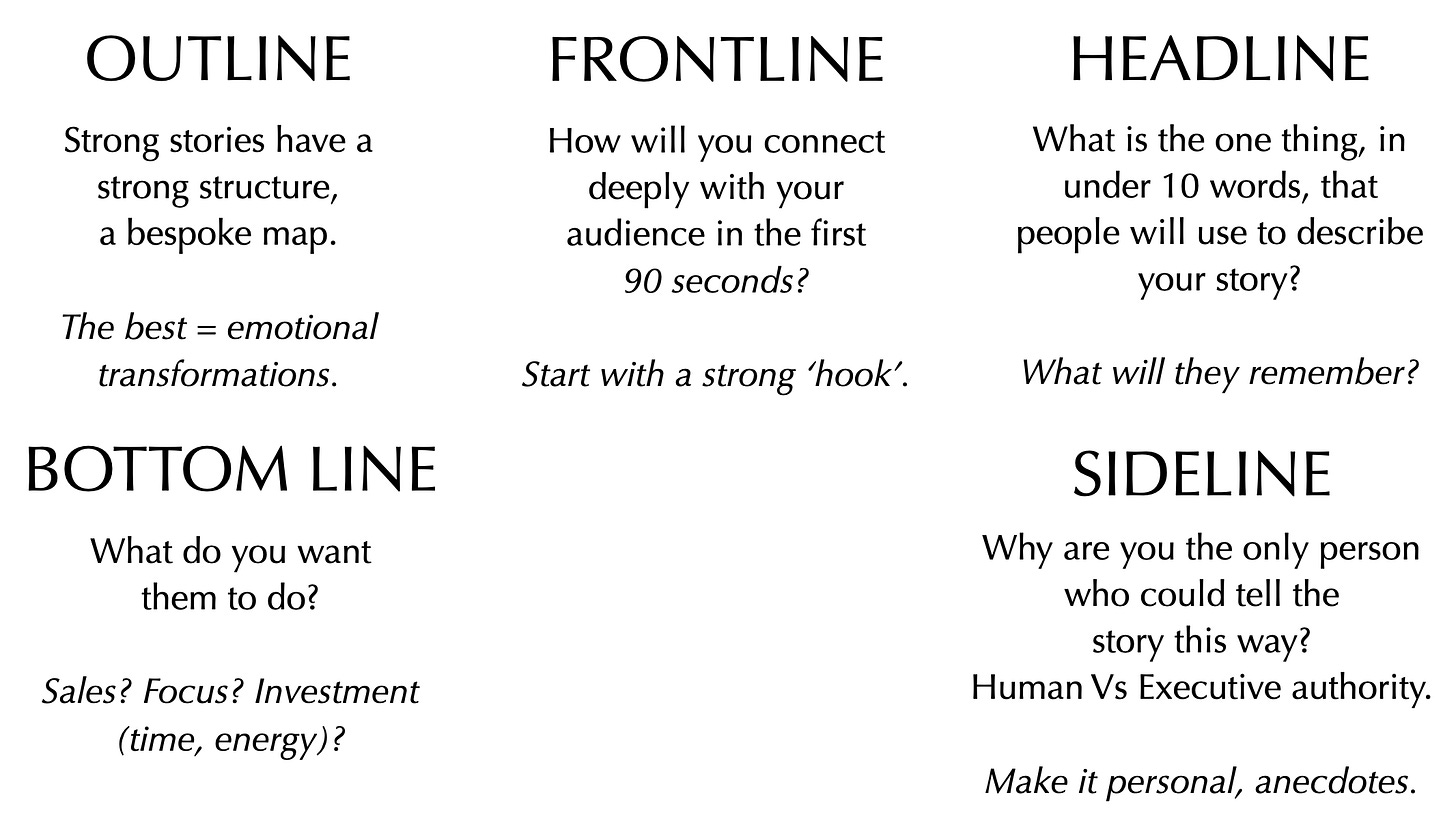 All of these are critical, but you also need other key elements, Ted Sorensen defines these as Outline, Frontline, Headline, Bottom line and Sideline.