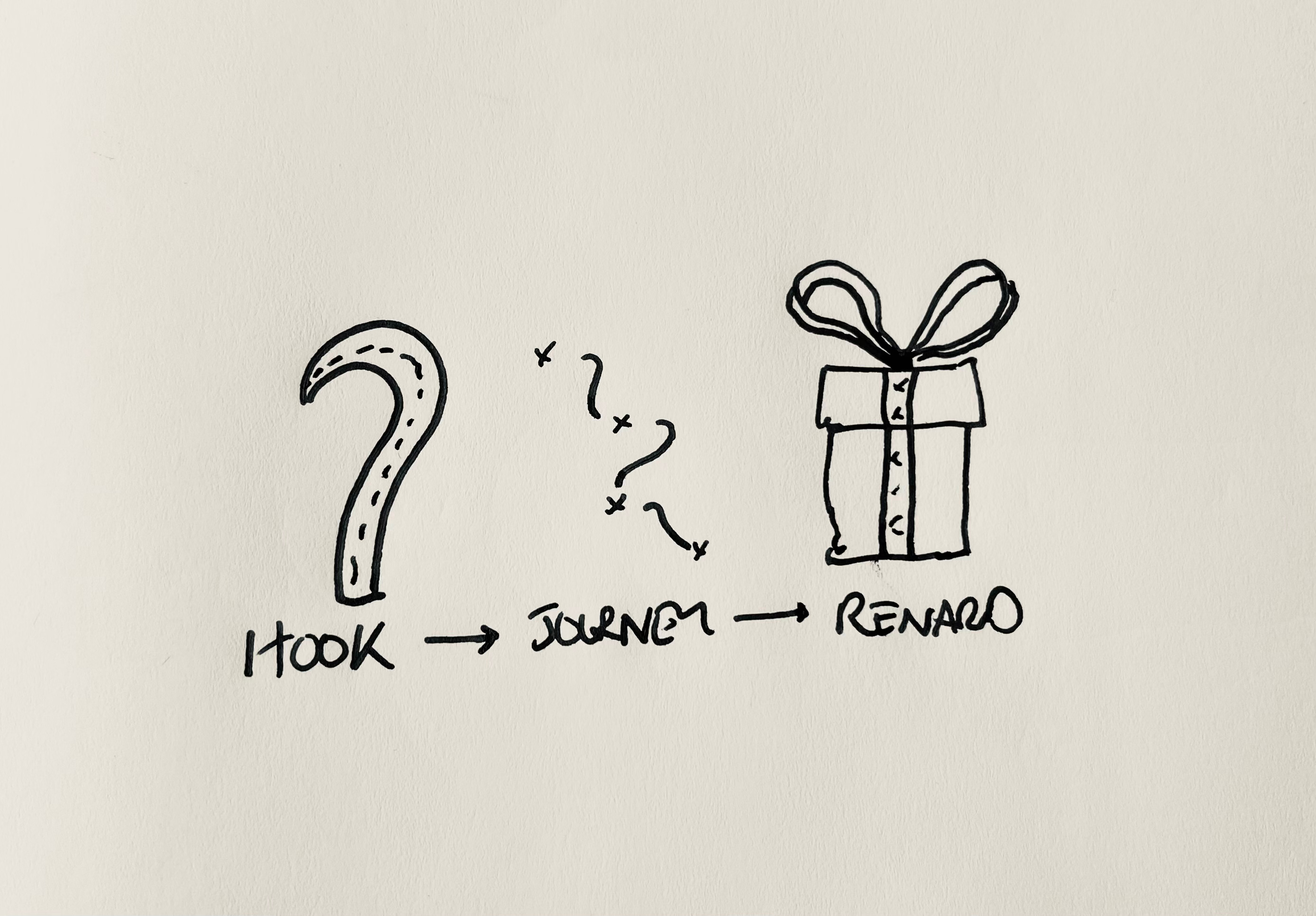 To ask - The hook: How do I get them to notice, to lean in, to engage (again think of surprise as a filter here)? The journey: how do I sustain that interest? Ask, as mentioned earlier, what emotions do I want to create at each step, in each of those manageable chunks? (actually write the emotions and the shifts down and look at how you can deliver them). The reward: then how do I link back to my beginning, how do I answer the question I have asked of myself and of them? How do those chunks, those emotional journeys steps add up to that reward?